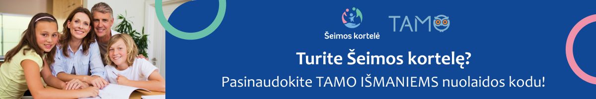 Norite naudotis TAMO IŠMANIEMS privilegija, – tereikia Šeimos kortelės programėlėje atverti TAMO nuolaidos aprašą ir ten rastą kodą suvesti užsakant paslaugą TAMO svetainėje.